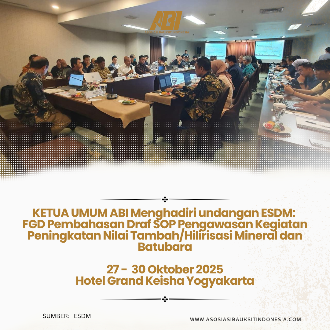 Berita Ketua Umum ABI menghadiri undangan penting dari Kementerian ESDM RI untuk sesi Focus Group Discussion (FGD) dalam rangka pembahasan Draf Standar Operasional Prosedur (SOP) Pengawasan Kegiatan Peningkatan Nilai Tambah/Hilirisasi Mineral dan Batubara. ABI Kritik Keras Kepmen 268 : ‘Bukannya Makin Hidup, Malah Makin Mati Penambang Bauksit’ Kamis, 16 Oktober 2025, 17:17 WIB Selamat Ulang Tahun PRESIDEN REPUBLIK INDONESIA – PRABOWO SUBIANTO Problematika Hilirisasi Bauksit dan Mimpi Swasembada Aluminium MIND ID Penarikan Aluminium dari Gudang LME Malaysia Perketat Pasokan, Harga Asia Tetap Stabil Finalisasi Kerja Sama Smelter Alumina di Lingga Tinggal Selangkah Lagi Asosiasi Bauksit Indonesia Surati Menteri ESDM, Kritik Perubahan Aturan HPM Presiden Prabowo Minta Menteri ESDM Hitung Cadangan Sumber Daya Mineral Indonesia dengan Standar JORC Bupati Kotim Ungkap Rencana Investasi Pembangunan Smelter Rp160 Triliun di Kecamatan Pulau Hanaut ABI Surati Bahlil, Minta Transaksi Bauksit Tetap Gunakan HPM Bergabunglah Dengan ABI Selengkapnya AFILIASI DAN KONSTITUEN